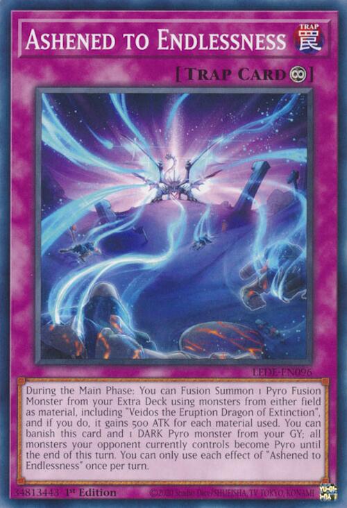 During the Main Phase: You can Fusion Summon 1 Pyro Fusion Monster from your Extra Deck using monsters from either field as material, including "Veidos the Eruption Dragon of Extinction", and if you do, it gains 500 ATK for each material used. You can banish this card and 1 DARK Pyro monster from your GY; all monsters your opponent currently controls become Pyro until the end of this turn. You can only use each effect of "Ashened to Endlessness" once per turn.