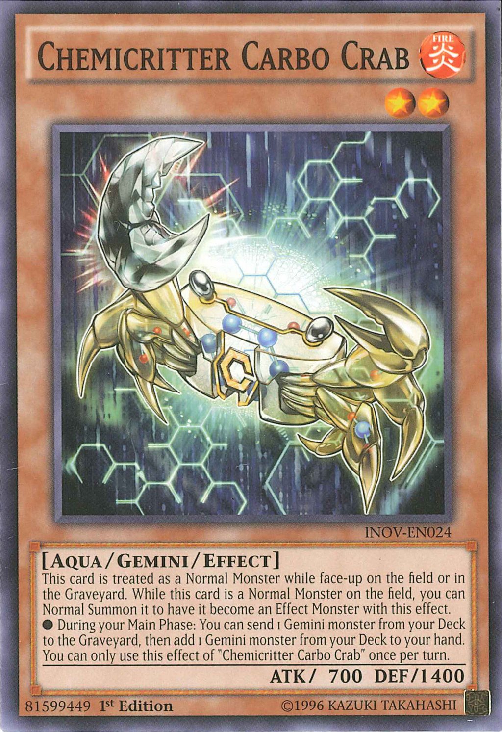 •During your Main Phase: You can send 1 Gemini monster from your Deck to the Graveyard, then add 1 Gemini monster from your Deck to your hand. You can only use this effect of "Chemicritter Carbo Crab" once per turn.